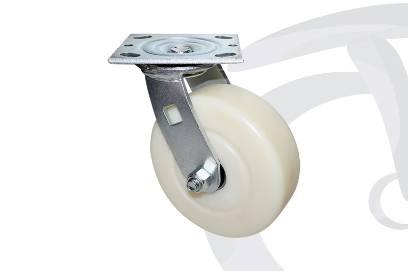 RODAJA DE NYLON EN BARRA 6″ X 2″ CON PLACA GIRATORIA Y BALERO (HERRAJE REFORZADO)